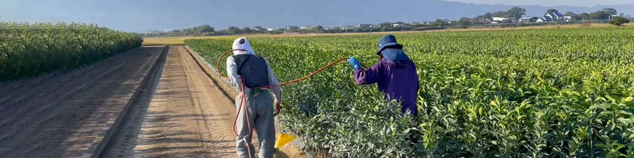 5月下旬から10月中下旬頃まで行います。病気に対しては殺菌剤を害虫に対しては殺虫剤を適宜散布します。薬剤の種類によって手散布で直接かけたりトラクターでかけたりします。特に病気ではカイヨウ病、害虫ではミカンハモグリガの防除に気を付けています。